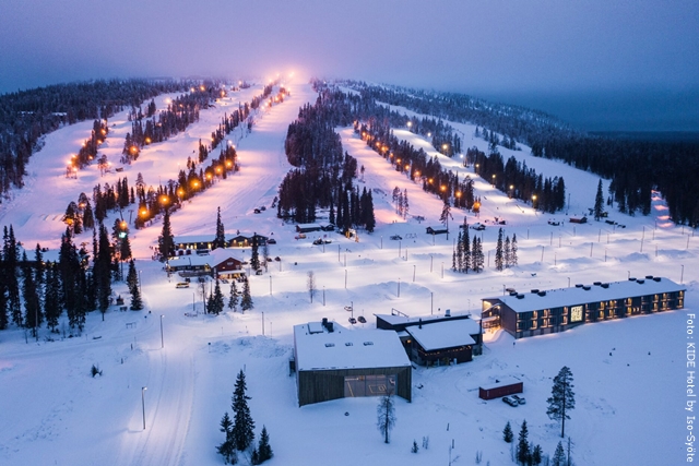 Das umweltfreundliche KIDE Hotel liegt am Fuß des Fjells mit direktem Zugang zu den Pisten und Loipen und bietet in angenehmem skandinavischen Ambiente alles für den aktiven Skiurlaub Finnland. Die 60 Doppelzimmer sind neben einem privaten Balkon alle mit einer Miniküche, Trockenschrank und Möglichkeiten zur Ski-Aufbewahrung ausgestattet. Einige Zimmer können für Familien mit Verbindungstür genutzt werden. 500 m entfernt vom Hotelgebäude inmitten der Wildnis gibt es 4 exklusive Suiten mit Glasdach zur gemütlichen Beobachtung der farbenprächtiger Nordlichter vom Bett aus.