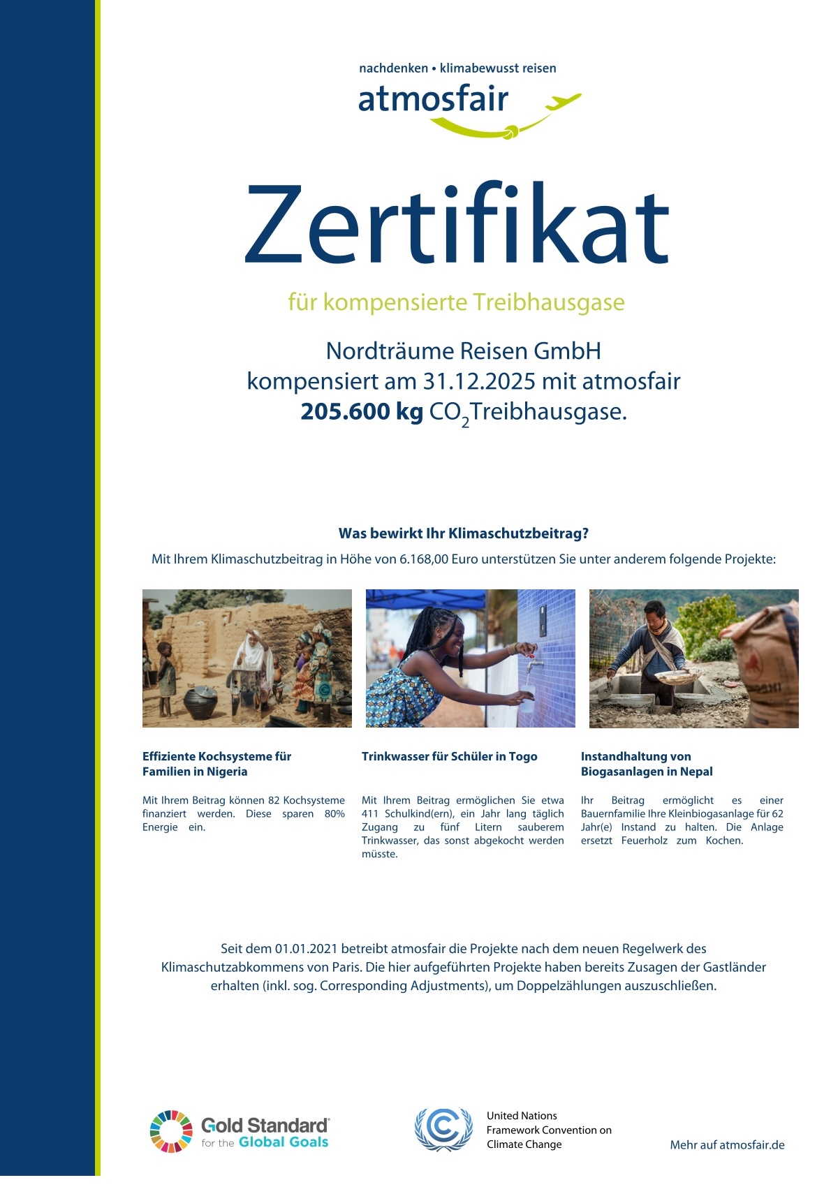 Die CO₂-Emission aller Flüge, die wir für unsere Kunden buchen, kompensieren wir bereits seit 2015 mit den Klimaschutzprojekten von Atmosfair.